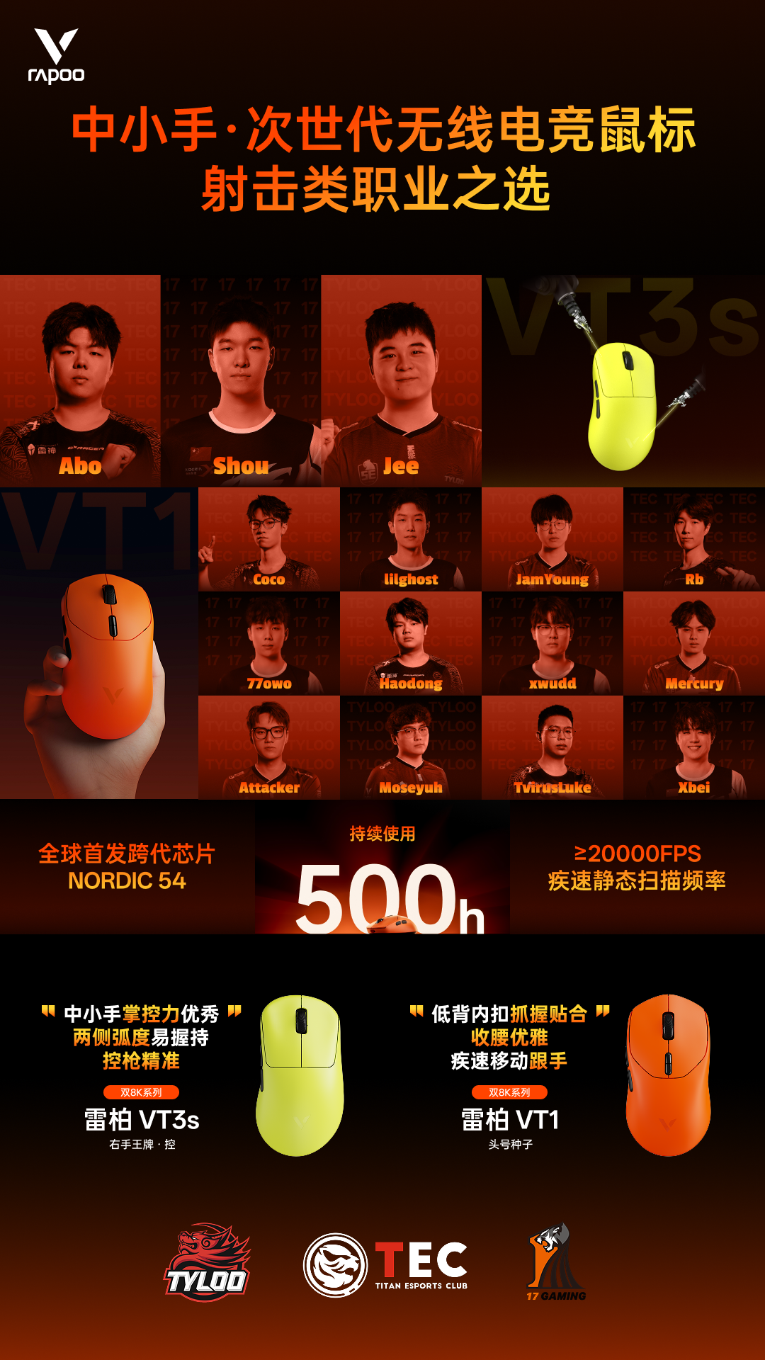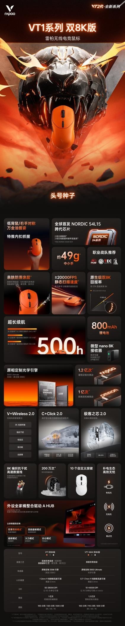 中小手,≥20000FPS静态扫描百小时续航,雷柏VT1二代系列电竞鼠标发布