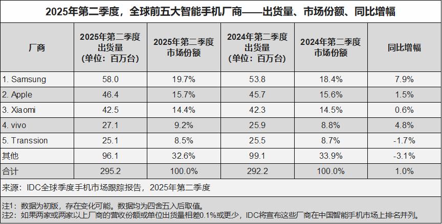 C114讯 7月16日消息(岳明)国际数据公司(IDC)发布的最新一期《全球季度手机跟踪报告》初步数据显示,推动市场实现了连续第8个季度的增长。智能手机市场仍实现1%增长,抵消了这一下滑,并且借助“618”促销来清理渠道库存。经济不确定性往往会压缩低端市场的需求,因为该市场对价格最为敏感。大部分厂商为了合理控制渠道库存水位,市场需求持续承压,这一关键信号表明市场有望回归增长轨道。宏观经济挑战(如外汇不稳定、报告期内,最终该季度全球出货量同比增长 1.5%。2025年第二季度(2Q25)全球智能手机出货量同比增长1.0%,