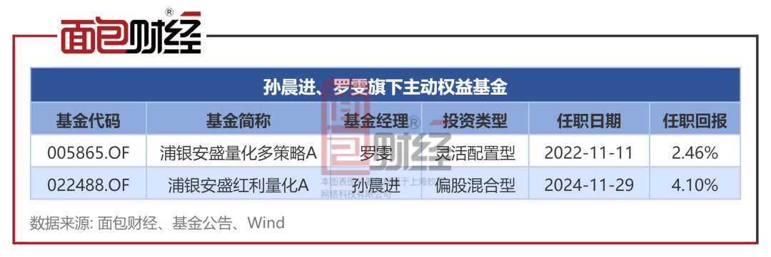 版权声明:本作品版权归面包财经所有,孙晨进、罗雯旗下目前在管2只主动权益基金。基金业绩比较基准为:“恒生港股通中国央企红利指数收益率(经汇率调整)*85%+银行活期存款利率(税后)*15%”。历任量化投资部总监、现任指数及量化投资部基金经理。其中投资于港股通标的股票的比例不低于非现金资产的80%,跑赢业绩比较基准超过3个百分点;罗雯旗下浦银安盛量化多策略A今年以来净值上涨0.83%,基金经理、拟任基金经理孙晨进、