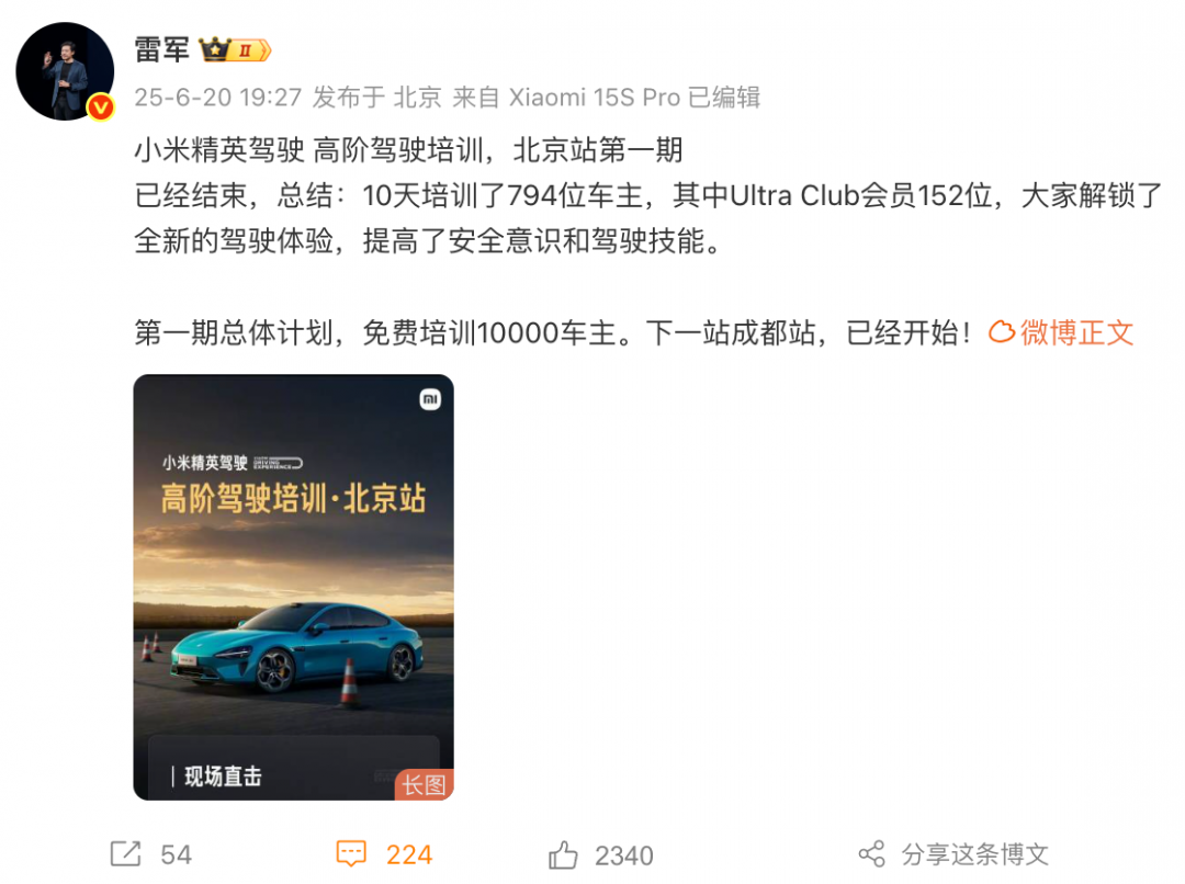 雷军:小米精英驾驶高阶驾驶培训下一站成都